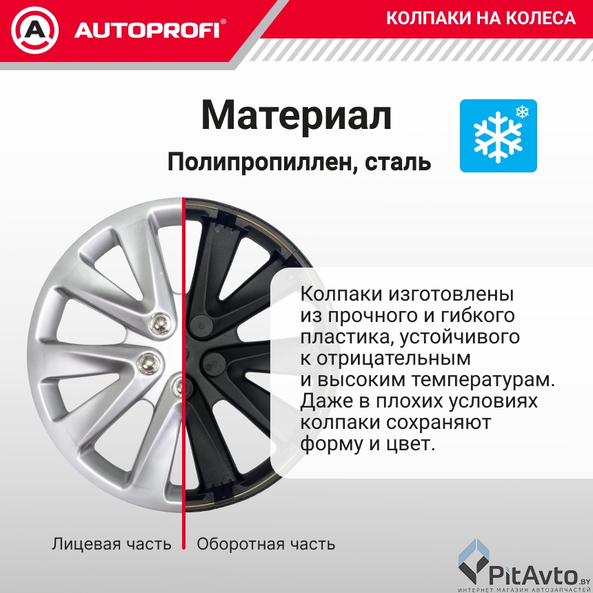 - Широкий диапазон размеров: В линейке AUTOPROFI представлены колпаки всех стандартных размеров, соответствующих радиусу колеса (R13, R14, R15, R16 и т.д.), что гарантирует совместимость с большинством легковых автомобилей.